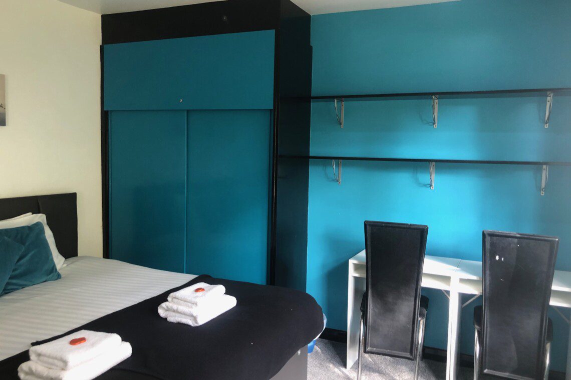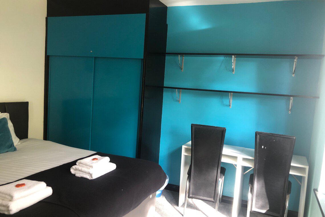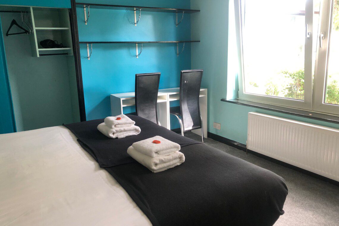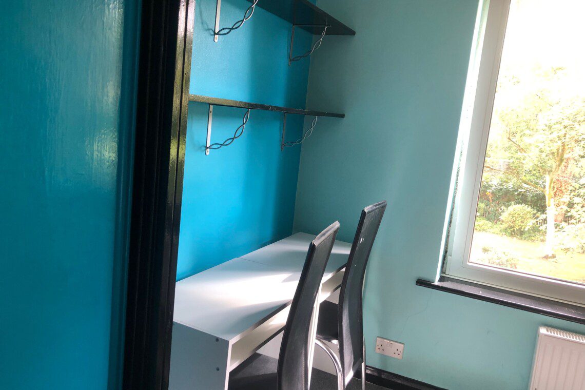 Your private room, with garden views, is equipped with a supering bed, generous wardrobe with shelves. There is also a desk and chair.